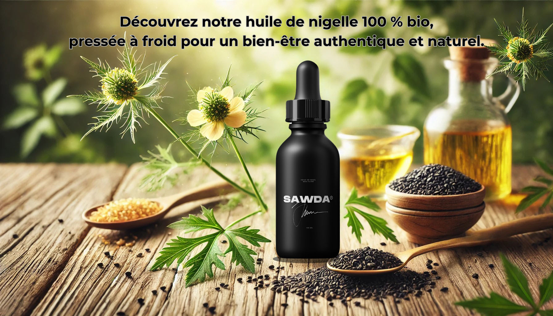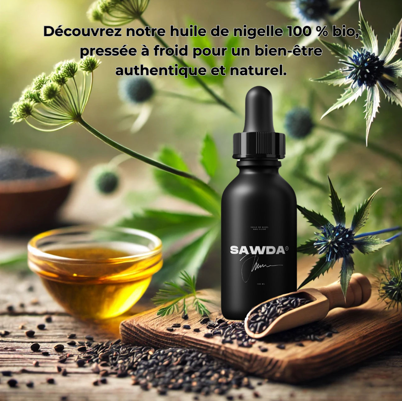 Chez SAWDA, nous croyons au pouvoir des trésors naturels pour sublimer votre santé et votre bien-être. Inspirée par les traditions millénaires et l’harmonie de la nature, notre huile de nigelle est 100 % bio, pure et pressée à froid, pour préserver tous ses bienfaits.
